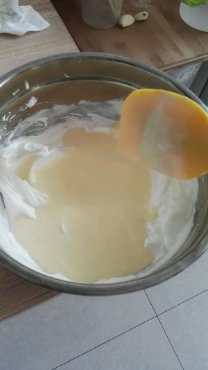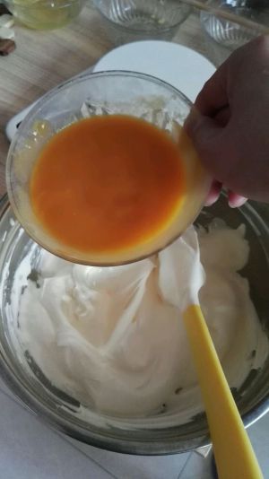 将降温后的浓稠蛋奶液,和打发好的鲜奶油混合均匀,再倒入芒果泥,用打蛋器再搅打几下,使其充分均匀即可