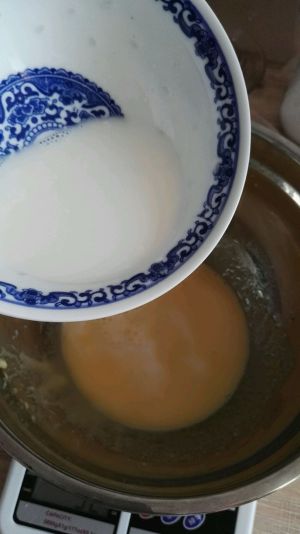 牛奶小火加热表面冒泡即关火,趁热牛奶慢慢倒入打好蛋黄液里,一边加一边快速搅拌(不能让蛋黄结块)