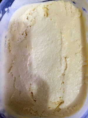 然后倒入冷冻12小时以上的冰淇淋桶内搅拌20分钟左右,最后倒入保鲜盒内放冷冻2小时后可以挖球食用。