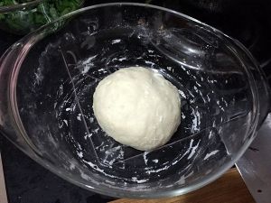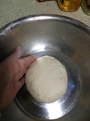 取一个盘子,盘面刷油,面剂搓成面团放入盘中。
