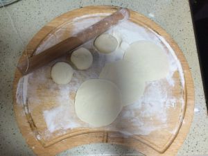 提前炒熟猪肉韭菜放凉,把面团擀出中间厚边边薄的饼就可以包肉馅了