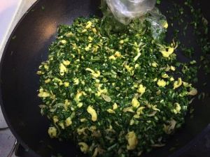 鸡蛋虾皮温度降下来后加入切好的韭菜,拌入香油;一定要让韭菜全部裹上油,再加盐;这样韭菜不会出汤,切记