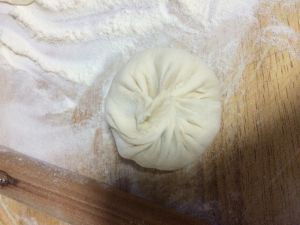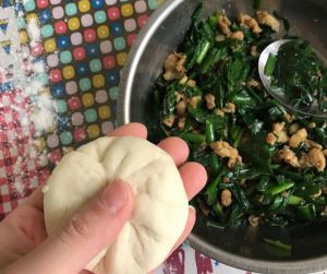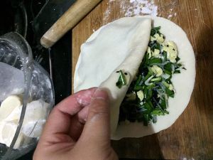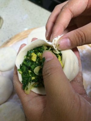 包成包子或直接包成大饺子状,略按扁,即成饼胚(我两种都做了,比较起来,大饺子状比较好做)。