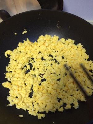 锅中放油预热,倒入提前打散的蛋液,马上用筷子顺一个方向快速搅拌,鸡蛋逐渐形成小碎块,越小越好