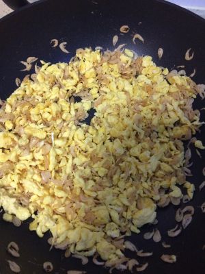 锅内加油预热,放入虾皮炒出香味;关火,加入炒好的的鸡蛋;放在锅中晾凉