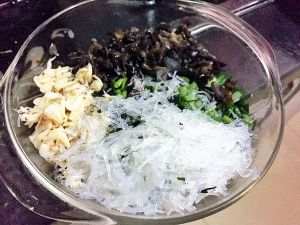 韭菜、鸡蛋、木耳、粉丝、虾皮,混合到早一个容器里,加一勺半盐,少许色拉油,一点白胡椒粉,一点味精,半勺黑芝麻,搅拌均匀待用。