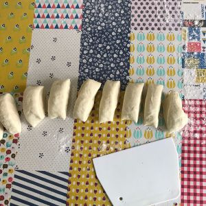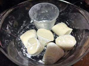 面板上抹油,把面团搓成长条,分成相等面剂。