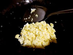 两颗鸡蛋,打散放一丁点盐,炒碎。