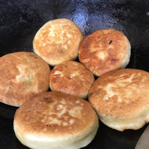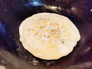 包好,轻轻压扁;就可以烙了,平底锅中放油预热,两面煎至金黄