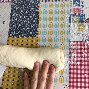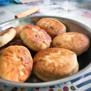 把醒发了的面团用擀面杖排出空气,分成一块一块的剂子,擀成皮把韭菜馅做成包子形状,再压扁成饼子。