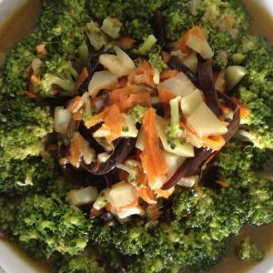 热入油入姜蒜煸香,投入西兰花根,香菇,木耳,萝卜丝炒一会加浓汤宝,加煮过西兰花的菜汤,煮沸加西兰花