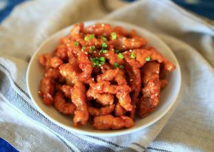 锅让稍微多点油.热至6层热放入里脊炸至微黄(一条条炸哦.不然会结块)然后再2次油炸.炸至金黄捞起去油.锅里放少许油加糖勾芡至粘稠放入里脊上色.快速翻炒.最后放入醋盐味精起锅