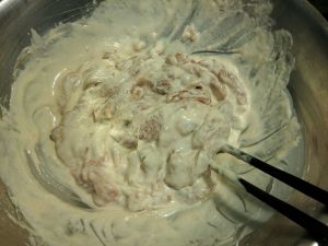 揉过之后,肉表面粗糙发粘,这样会更容易挂糊,腌半个小时