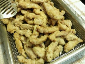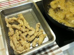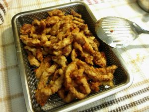 这样炸出来的肉条,挂浆很牢,全部炸好