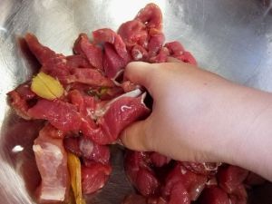用手开始揉抓肉条,不停的揉抓,让肉吃水,同时,破坏肉的组织,肉条会更嫩,多汁,松软