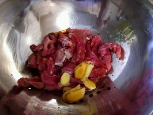 将肉放在大盆里,放入一匙料酒,少许生抽,胡椒粉,一点点盐,生姜片,然后倒入小半碗水