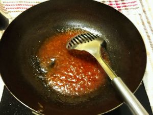 糖醋汁倒进锅里,小火熬到糖起大泡,变粘稠,醋味挥发,然后放入肉条快速翻炒,动作一定要快,幅度要大,才能裹汁均匀
