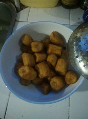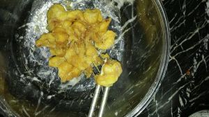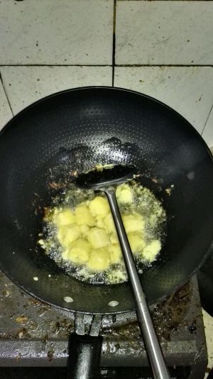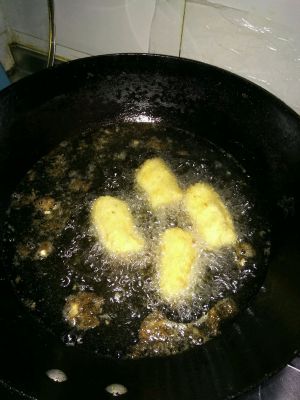 一切准备就绪,把锅里倒好油,待油热以后,把香蕉段放到锅里炸出金黄色