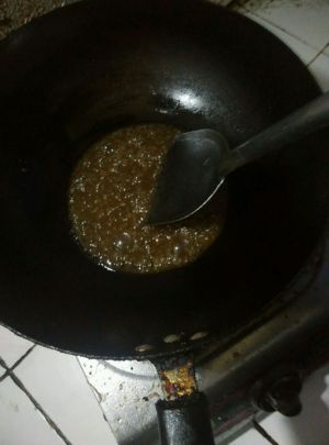 重起锅,放一调羹油油少量,油烧热后放三分之一矿泉水瓶子的水,糖一把,想更甜点就多放些,小火。一直一个顺序搅