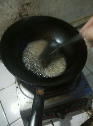 锅中加入少量油,少量水,适量白砂糖顺时针方向不断搅拌(糖量根据个人口味调放)