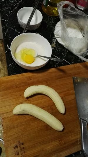 将香蕉去皮,随后准备2-3勺淀粉,打入一个鸡蛋并加入适量水搅拌均匀,注意不要太希