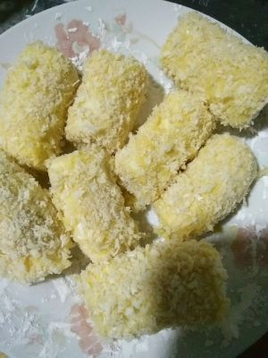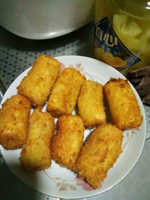 把裹好的香蕉段在蛋液里占一下,然后裹上面包糠