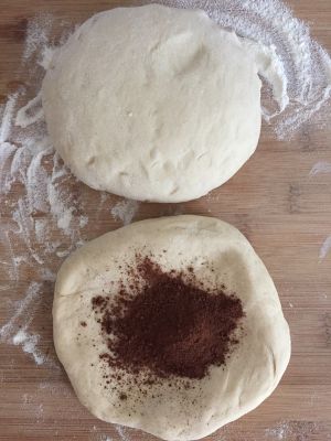 发酵好的面团发成两份,取其中小块的面团放上可可粉。