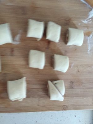 卷好之后切块。尽量卷的紧一些。我这个有点松。必须做过一次就有经验了。哈哈。然后放进锅里在发酵半个小时。开火,大火18分钟就可以了。馒头比较大的话需要蒸25分钟。