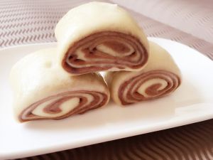 分别擀成片。我擀的有点太薄了,把可可的这片放在上面。卷起来就可以了。
