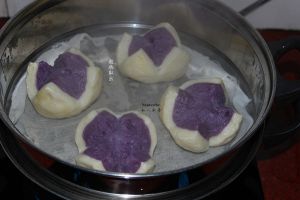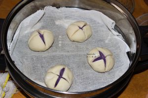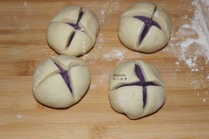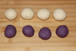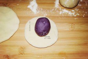 发酵好的面粉切小段擀成圆形,再将紫薯馅放在中间包好。