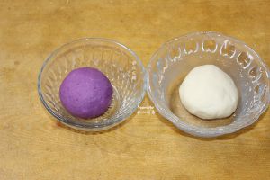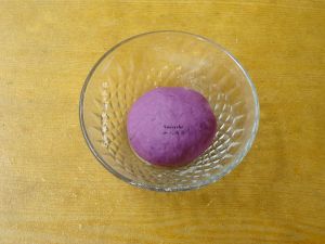 50克紫薯、50克面粉、1克酵母、5克白糖,温水拌均;