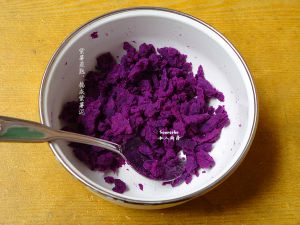 剩余的紫薯全部压成泥,然后再搓成丸子状。觉得粘可以手心上沾点水。