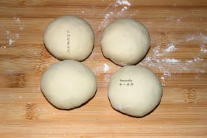 发酵的面团,揉、排气,再次揉成光滑的长面团;各分四个小面团,揉光滑;