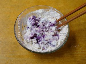 面粉倒入紫薯泥中,和好面后放置一旁发酵。如果觉得打出的泥太多,可以用紫薯泥一点点加入面粉,这样可以少和一点面,比较好掌握量。