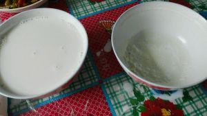 牛奶煮微热后倒入碗中,凉了再加入蛋清搅拌