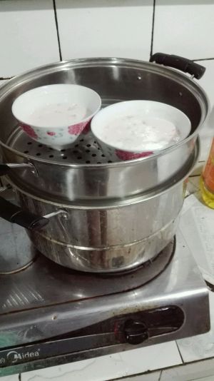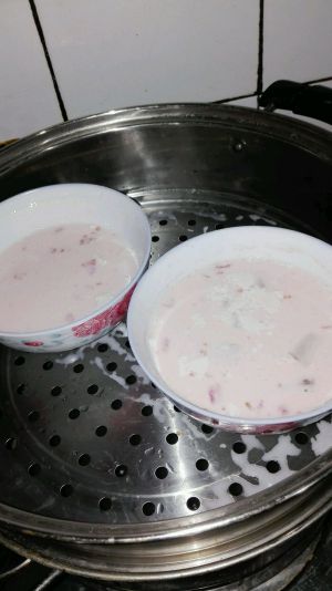 把双皮奶的碗盖上保鲜膜,中小火加热15分钟,不要打开盖子,焖5分钟!