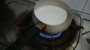 将牛奶倒入锅内煮开,关火,自然降温,等待奶皮的产生!