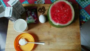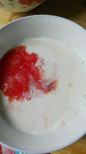 将西瓜榨成汁,与拖肥里面的果肉混合,导入牛奶中,搅拌均匀