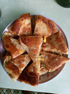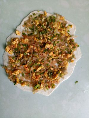 鸡蛋充分打散,均匀浇在葱油饼表面,蛋液稍定形后,翻面,将鸡蛋煎熟。