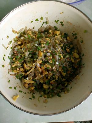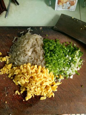 粉丝用开水烫软切小条,葱切小碎,鸡蛋也切碎。