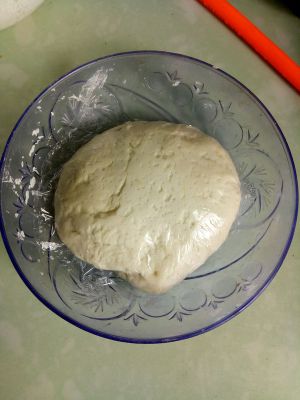 准备面粉,用凉开水搅拌均匀,面粉和成团,盖上保鲜膜发酵30分钟。