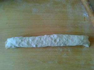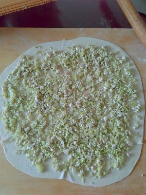 面团醒好后,取一半面团擀成饺子皮厚度的面皮,面皮上均匀铺上豆腐馅,四周留一公分半的空隙,防止接下来卷的时候,馅子露出来。