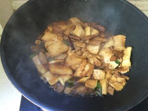 我先炒了一下支竹,是错的,应该先炒肉,再放支竹和豆腐,适当加点水。加盐和蚝油调味。