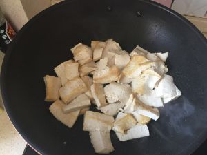 先倒入少许油把豆腐先煎成金黄色捞出,煎豆腐的时候先放入一点盐,目的是防止粘锅,和豆腐更好入味儿,去掉豆腥味儿