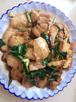 锅内剩适量油,放入蒜片爆炒,然后把青椒、红萝卜、香菇、猪肉倒入一起炒约2分钟。后放入青蒜和煎好的豆腐,加入适量水、酱油、盐及豆瓣酱,盖上锅盖煮约3分钟(视水量大小,煮久则豆腐会更入味)。