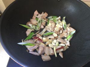 倒入适量的色拉油,先把五花肉炒至变色,然后放入葱姜蒜和干辣椒爆香