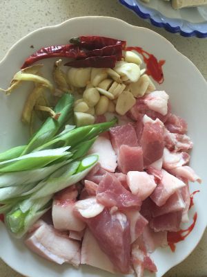 配菜有五花肉切片,葱切马蹄,姜切丝,蒜切成片,干辣椒切段