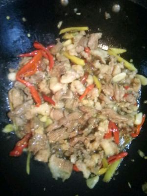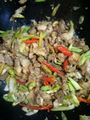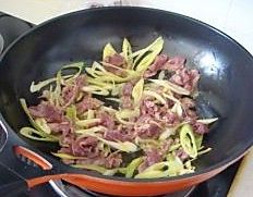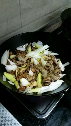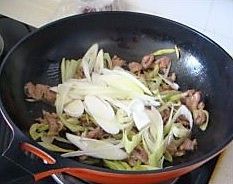 洗净锅下油 大葱入锅翻炒出香味后下入羊肉片。