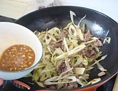 将调好的芡汁倒进去炒匀,让每片羊肉上都裹上汁。