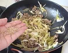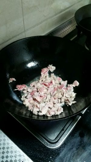 炒至变色后加入糖翻炒均匀,再倒入大葱炒香